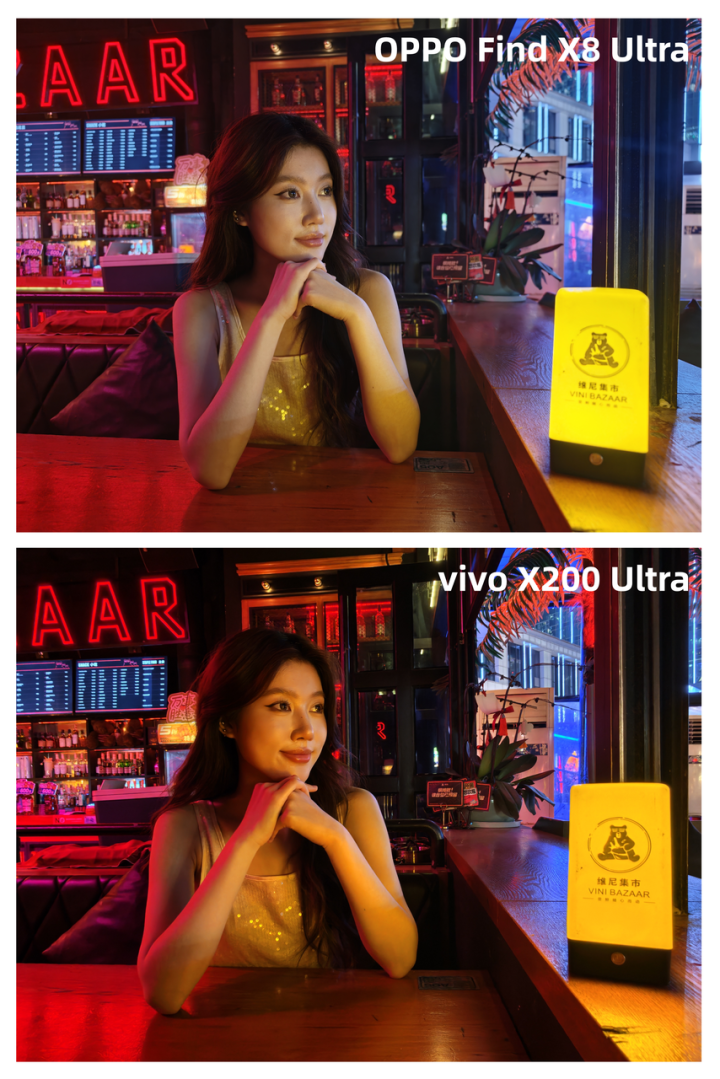 比如这组暗光环境下的实拍,Find X8 Ultra的人脸明显受环境光影响较小,肤色更显白皙自然,看着就很有氛围感;vivo X200 Ultra虽然解析力同样在线,但人脸还是被灯光映射的偏红了一点。即便在超长焦这块,Find X8 Ultra也能和vivo X200 Ultra打的有来有回,甚至色彩、细节方面的表现,都要更好一丢丢~